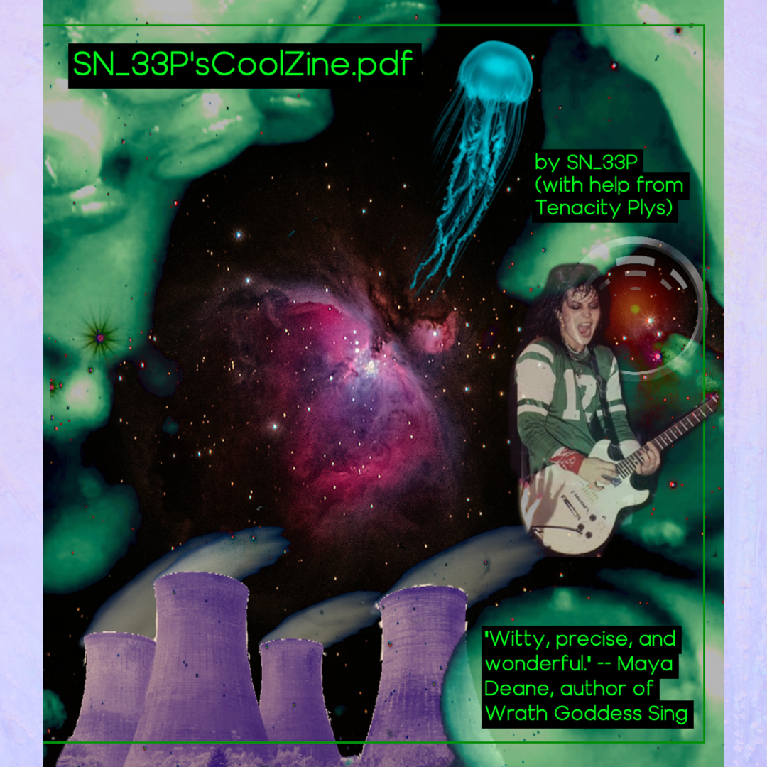 "I saw an early version of this project performed at the World Trans Forum and fell in love with the idea of a naive artificial intelligence writing a zine to cheer up its doomed human creator. The tone of SN33P's zine is cheerful, its zany dark humor and sly pathos layered and developed with a care that makes it look effortless, but this is a story that lingers in the mind. The familiarity of the stock science fiction elements allows Tenacity to craft their dramatic irony and comedic timing so deftly that the familiar becomes new again and rings true. Witty, precise, and wonderful." —Maya Deane
