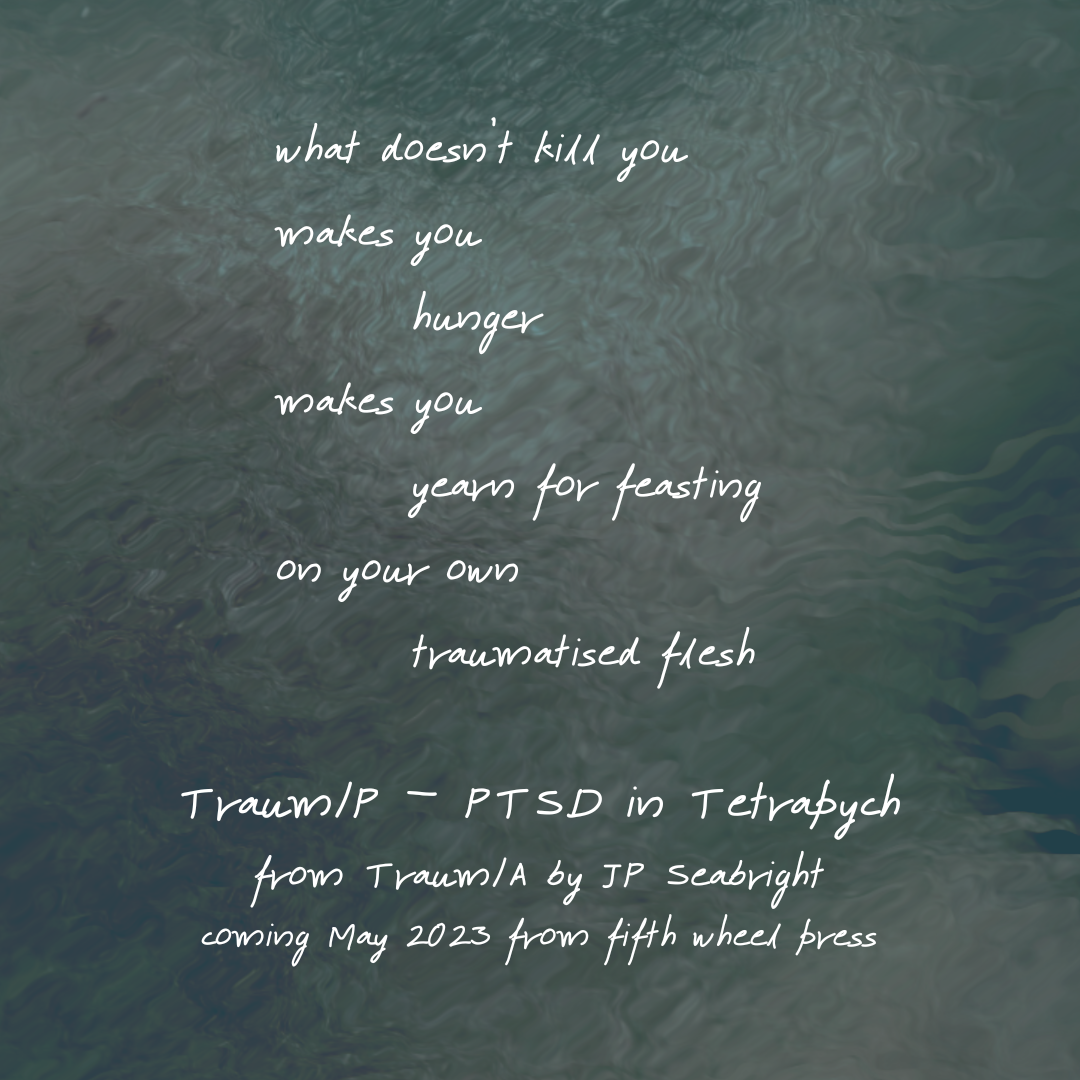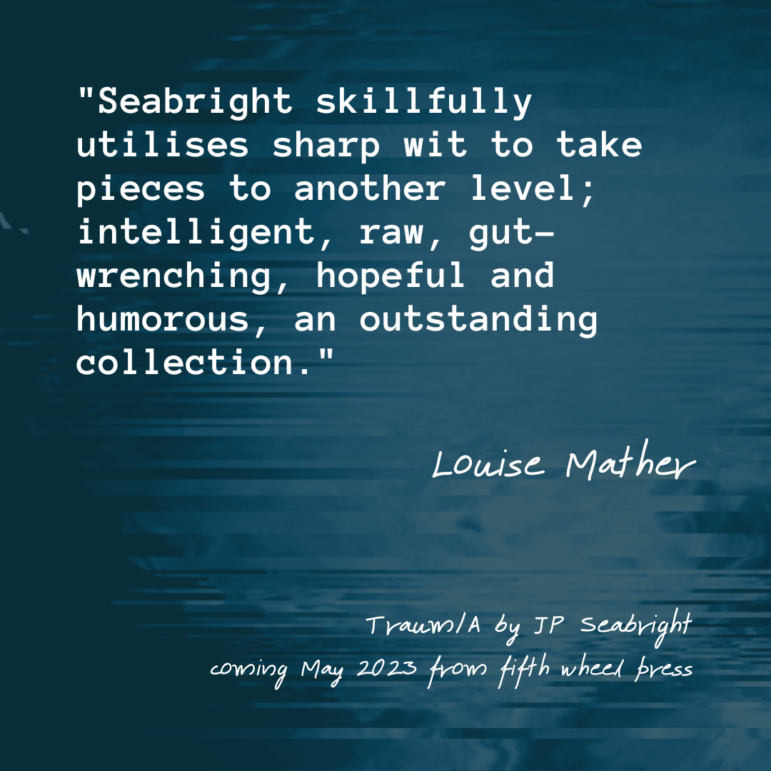 “Traum/A is an insightful, engaging and masterful experimental collection navigating the origin and symptoms of trauma and exploring societal expectations through the use of visceral and innovative poetry, prose and unique and dynamic artistic mediums. Taking the form of an abecedarian catalogue, JP Seabright is adept at word play and articulating thought processes and complexity of emotion through the use of different and original techniques. Pushing the boundaries on what we're allowed to talk about, powerfully using erasure of their own poetry to demonstrate the reoccurrence of trauma, Seabright skilfully utilises sharp wit to take pieces to another level; intelligent, raw, gut-wrenching, hopeful and humorous, an outstanding collection.” —Louise Mather, author of The Dredging of Rituals and editor of Acropolis Journal