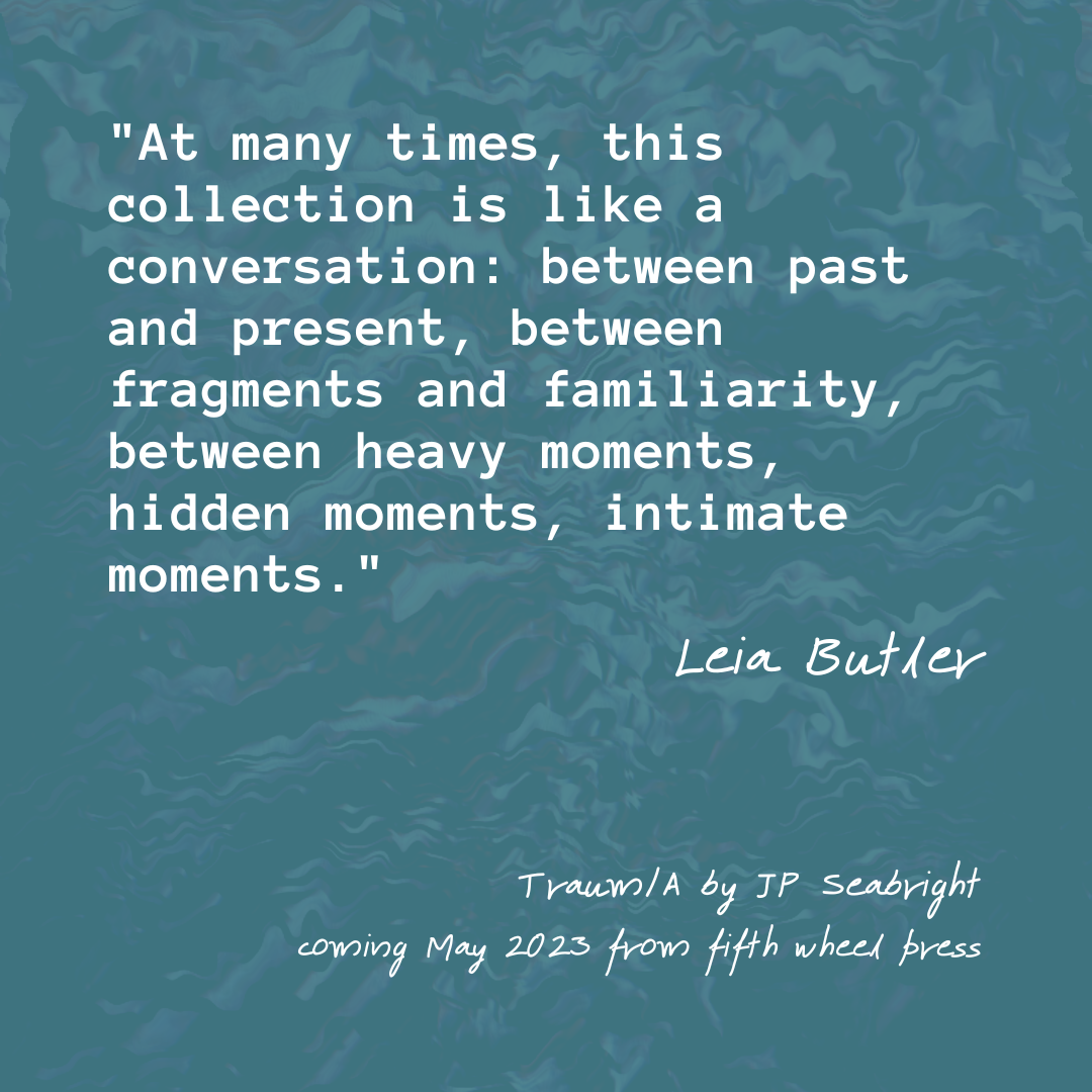 “JP's collection explores trauma in ways that are undoubtedly raw and shattering, yet we also have moments of release. At many times, this collection is like a conversation: between past and present, between fragments and familiarity, between heavy moments, hidden moments, intimate moments. But it is also between author and reader, and Traum/A has pieces that provide points of connectivity that makes this collection an opportunity for open reflection.” —Leia Butler, Founder and EIC of Full House Literary, author of Tear and Share (Broken Sleep Books, 2021)