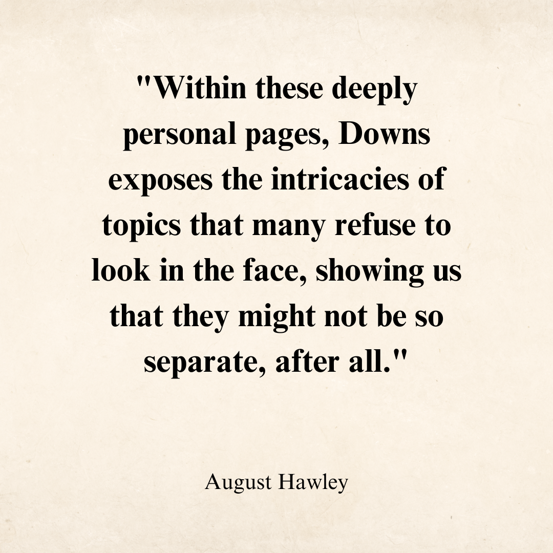 “Extraordinarily clever and vulnerable. Where the Men Come From reads like the diary of a close friend—honest, relatable, poignant. Full of intimate poems that reach into the darkest parts of life, and light them up with a spark of understanding—a book that calls out, breaks open the wound saying “you may not have been there, but you know how this feels.” Brimming with grief, godlessness and the strangeness of existing, Downs’s writing is truly a collection to treasure.” —Melanie Currie, author of Kaleidoscope