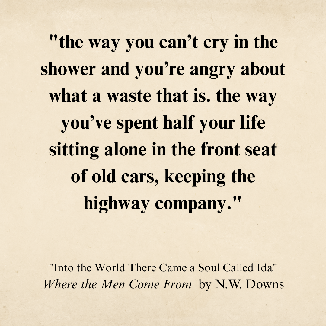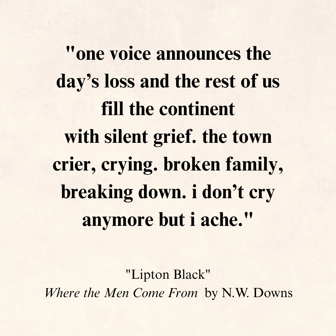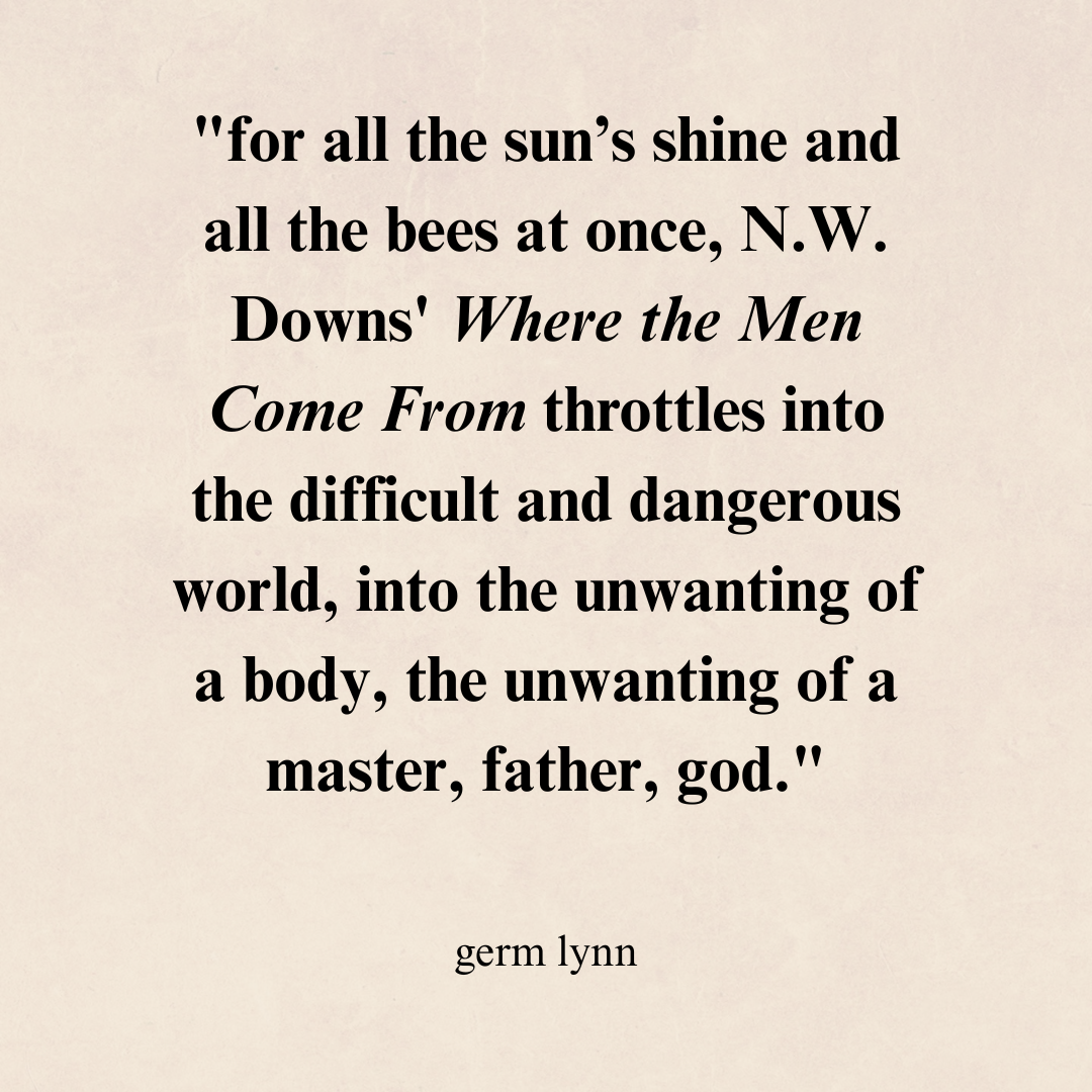 "The poem is too coy, grasping at straws, describing the swell and flex of the universe like everything is beautiful … o how the pomegranate undone is beautiful and not just another broken heart! But for all the sun’s shine and all the bees at once, N.W. Downs' Where the Men Come From throttles into the difficult and dangerous world, into the unwanting of a body, the unwanting of a master, father, god. The world is too much with us and yet our loneliness is all consuming. Down’s mournful and nimble poems touch tenderness and romance with the severity of an enduring myth, disposing of biblical lies and offering affirmations for sharp thoughts, crumbling marble arches, the wild shape of an identity, a life.